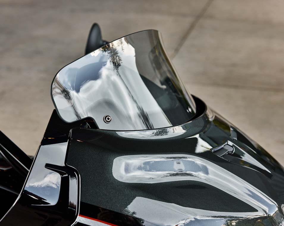 | Info entretenimiento | Pantalla táctil de 7 pulgadas gestionada por RIDE COMMAND con reloj en tiempo real; temperatura ambiente; rumbo, monitor información de audio; mapa/navegación; estado del Bluetooth para teléfono y auriculares de casco, estado del vehículo (presión neumáticos, voltaje; horas de funcionamiento del motor, cambio de aceite); información del vehículo (velocidad, autonomía, RPM; marcha engranada); datos actuales de viaje (distancia, tiempo en marcha, tiempo parado, altitud, cambio de altitud); contadores parciales de viaje; selección de modo de conducción; brillo pantalla; códigos de avería del vehículo; integración Apple CarPlay. |