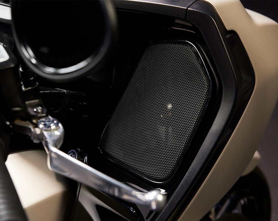 Los altavoces de alta potencia del carenado y el maletero ofrecen 200 vatios de sonido cristalino. También incorpora un ecualizador dinámico que se ajusta automáticamente al ruido de la carretera, el viento y el motor.
