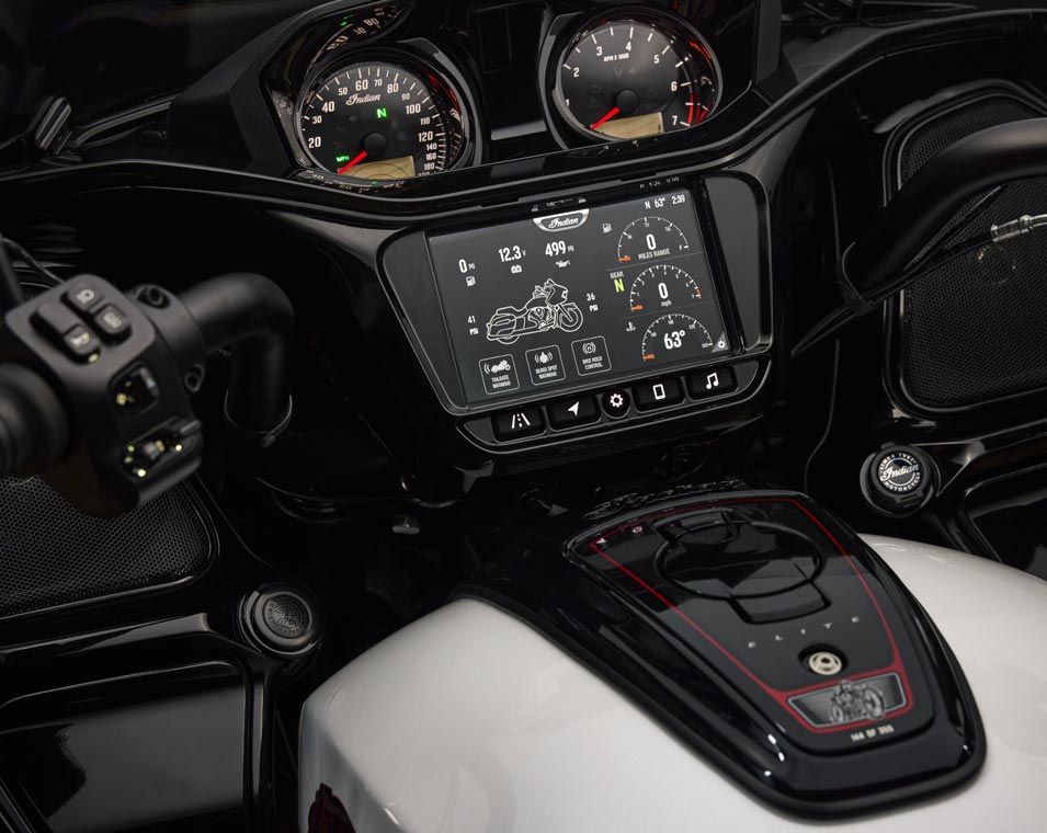 | Info entretenimiento | Un monitor de 7" gestionado por RIDE COMMAND con pantallas de indicadores personalizables, conectividad Bluetooth®, modos de conducción seleccionables y más. RIDE COMMAND + instalado de fábrica. Unidad de telecomunicaciones (TCU), GRATIS por un año, proporciona Apple CarPlay®, salud del vehículo, localizador de la moto, búsqueda intuitiva de destino y más (las funciones y la conectividad varían por país) |